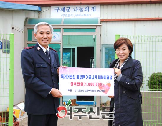 경기도노인전문여주병원 간호사회에서는 지난 2일 여주지역 소외된 홀몸어르신들에게 따뜻한 겨울을 날 수 있도록 병원자체 바자회에서 마련한 성금 100만원을 구세군 여주나눔의 집에 전달했다.