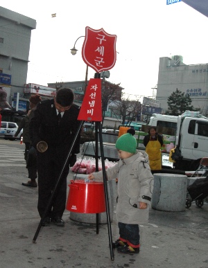 추운 날씨에 사랑의 종소리를 자선냄비에 하나님의 축복이 가득 하기를